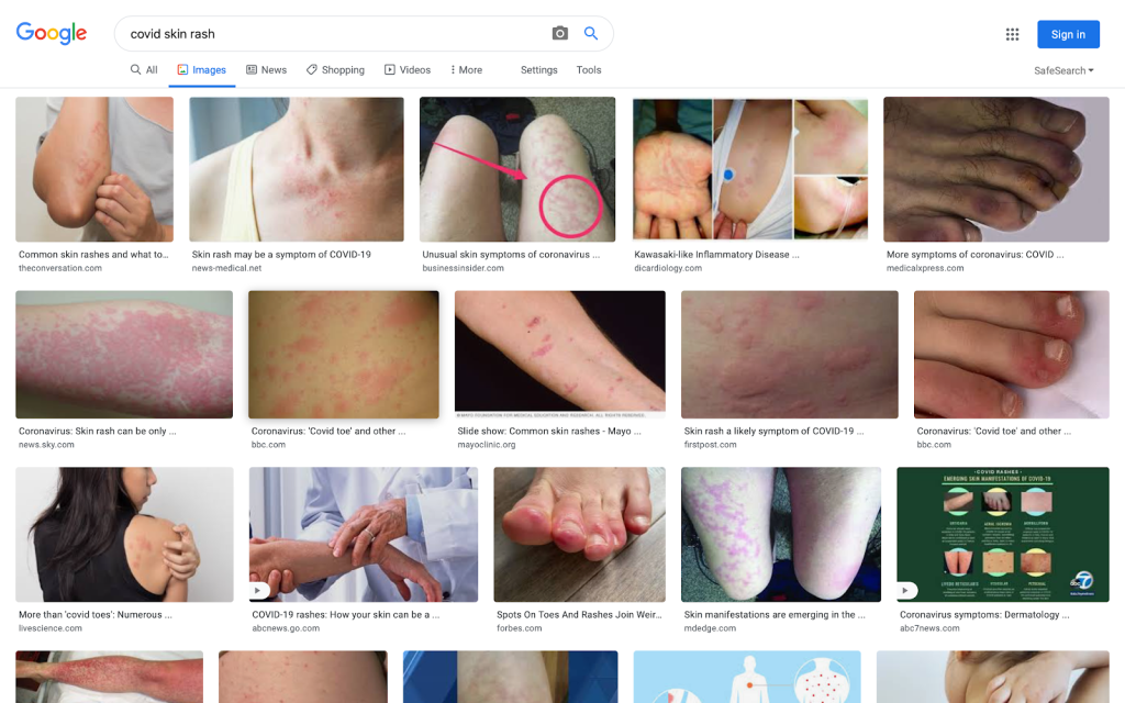 - Google Images. COVID skin rash [Internet screenshot]. 2020 [cited 2020 Aug 17]. Available from: https://www.google.com/search?q=covid+skin+rash&newwindow=1&rlz=1C1CHBF_en-GBGB862GB862&sxsrf=ALeKk01Oj0_VHw268zOesEkcLJHJ6uL8lQ:1598560350834&source=lnms&tbm=isch&sa=X&ved=2ahUKEwiE5vOunbzrAhWCQs0KHcFgDQ4Q_AUoAXoECCAQAw&biw=1920&bih=937